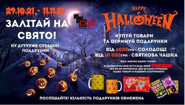 Тільки до 11.11.2021 приймайте участь в акції «Happy Halloween» та отримуйте подарунки. Купуйте товари на зазначені суми в одному замовленні та обирайте подарунок.