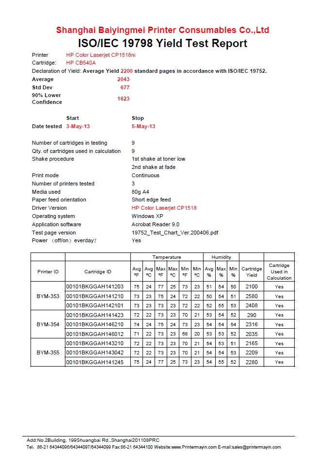 Результати тестування кількості копій картриджа CB540A відповідно до ISO / IEC 19752