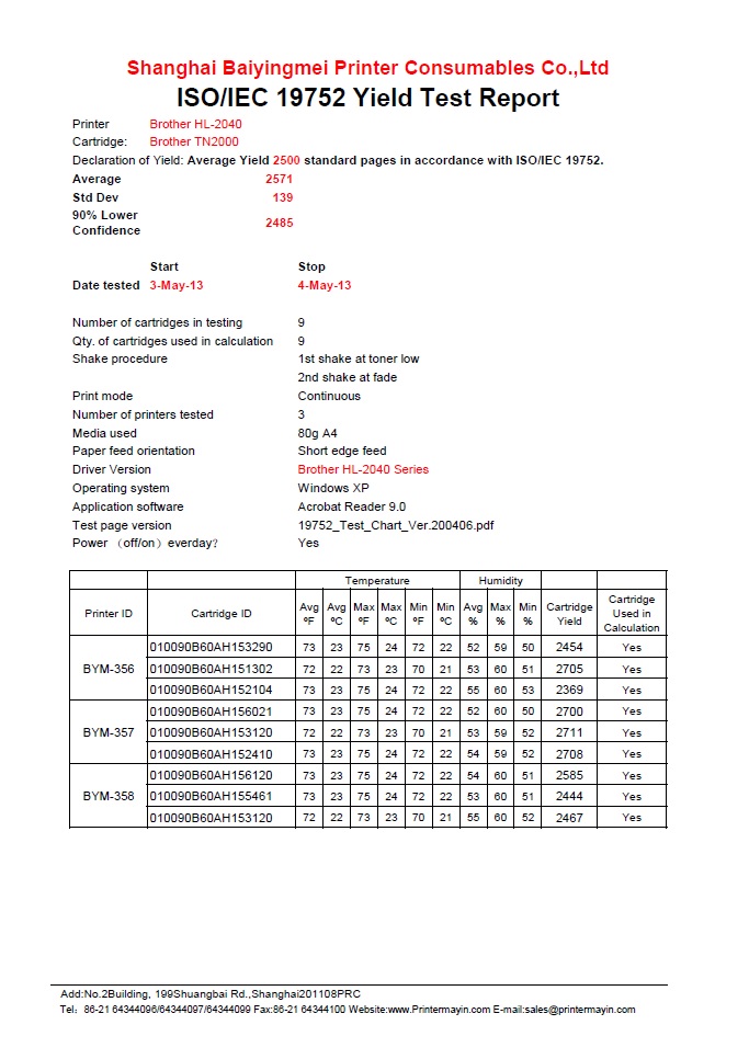 Результати тестування кількості копій картриджа TN2000 відповідно до ISO / IEC 19752